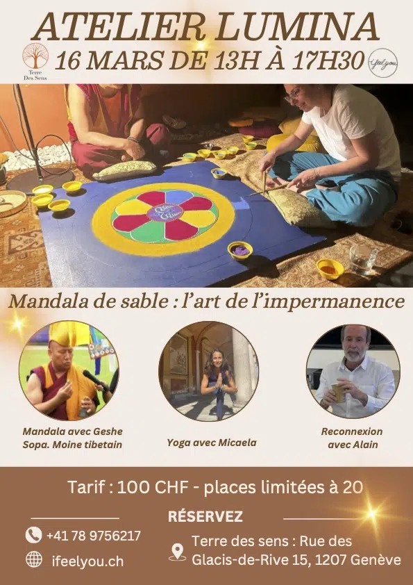 L’Atelier Lumina, débutera par la création d’un mandala de sable, une pratique tibétaine symbolisant l’impermanence, guidée par Geshe Sopa, moine tibétain.